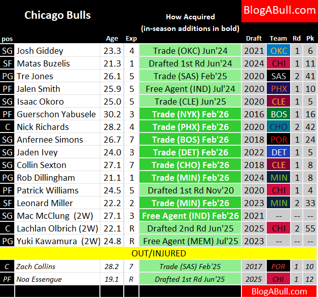 Out are Coby White, Ayo Dosunmu, VUC, Kevin Huerter, Dalen Terry, Julian Phillips, Jevon Carter, and 2-Way contract player Emmanuel Miller4.